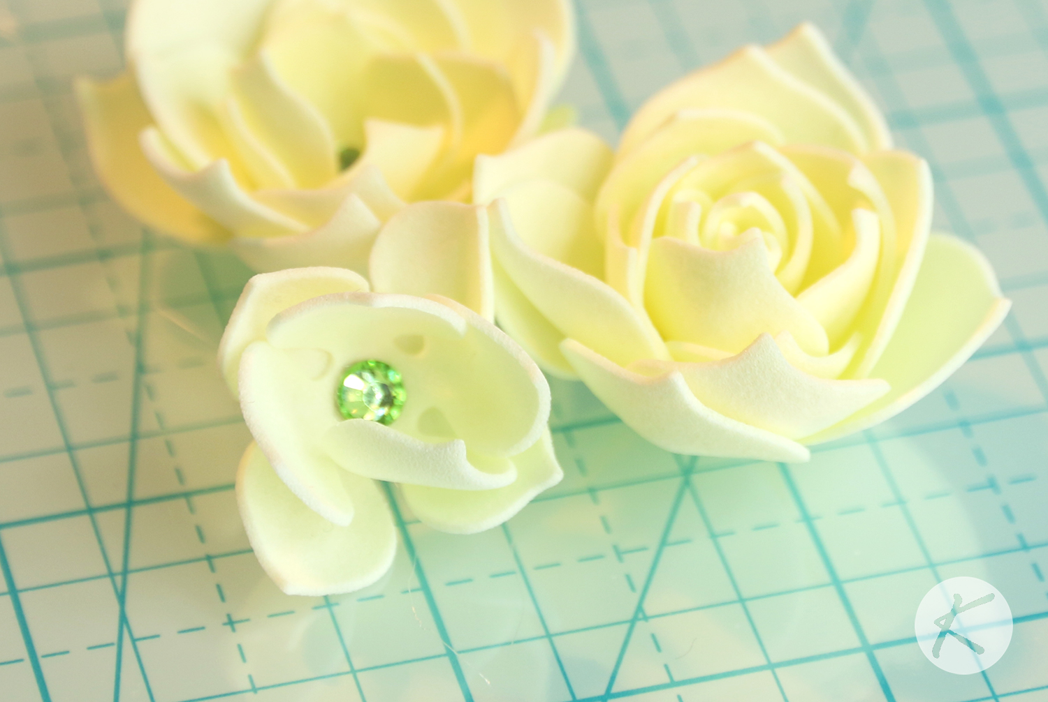 W tym przypadku nie potrzebowałam żadnych ozdóbek, wystarczyła sama pianka. Ale kwiaty można też formować w taki sposób, żeby środek wypełnić pręcikami, cyrkoniami, guziczkami lub ćwiekami. Ten ostatni sposób też daje bardzo ładny efekt i na upartego nie trzeba nawet stosować kleju, bo ćwiek wszystko ładnie będzie trzymać. Problemu z przebijaniem pianki nie ma, nawet kilku warstw.