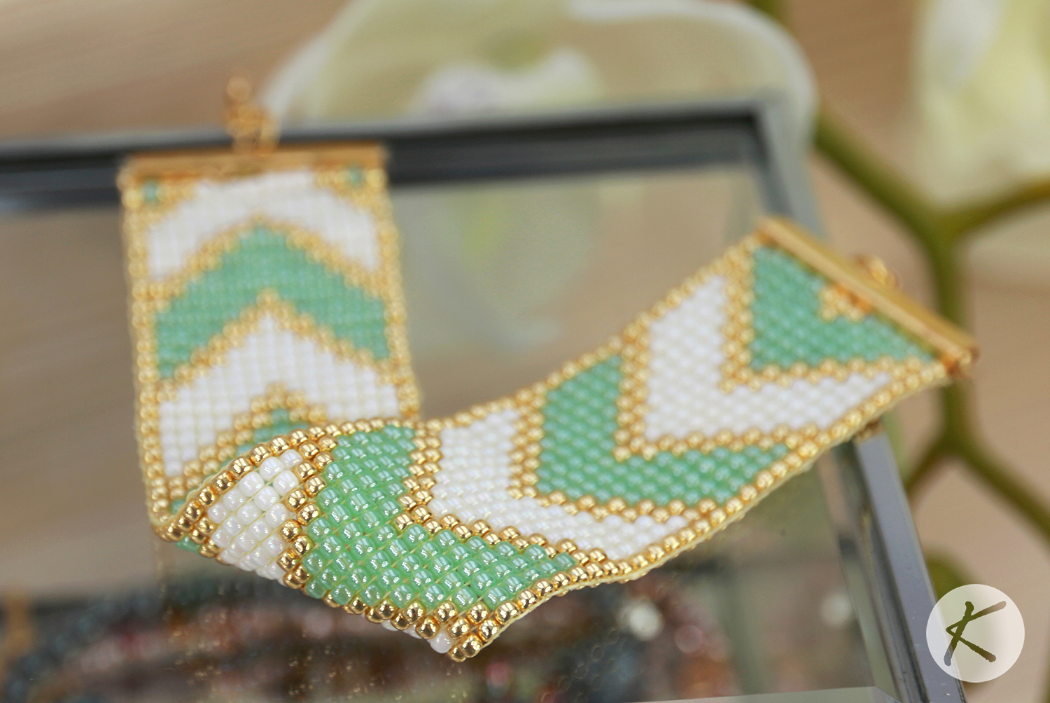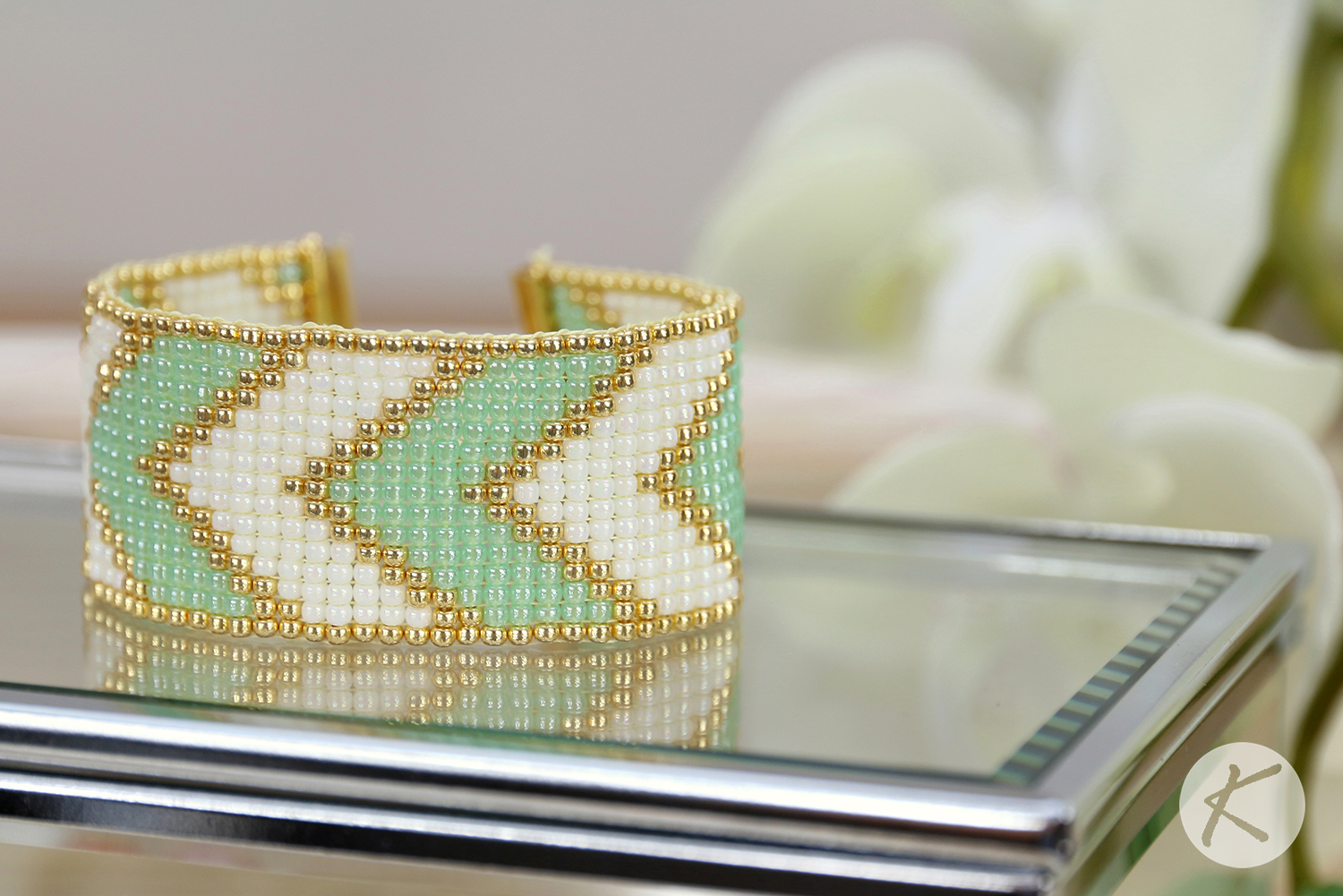 Bransoletka nie była rozpisana tak dokładnie, jak bym tego chciała, więc musiałam sama poszukać koralików w odpowiednich kolorach. Zajęło mi to trochę czasu, ale jestem bardzo zadowolona z efektu 🙂 Koraliki, które wybrałam, to oczywiście Toho Round 11o w kolorach: Permanent Finish – Galvanized Starlight; Ceylon Celery; Opaque – Rainbow White.
