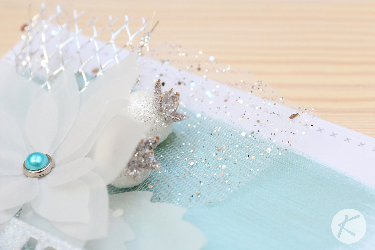 Nie byłabym sobą, gdybym nie dodała różnego rodzaju siatek. Na kartce znalazła się także srebrna organza brokatowa, o której wspominałam w TYM filmiku. Oba materiały pięknie się błyszczą, zwłaszcza organza, bardzo starałam się uchwycić ten piękny błysk, ale jak wiecie to wcale nie jest takie proste.