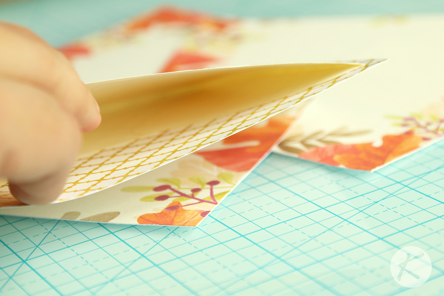 W tym tygodniu usiadłam do listopadowych kart, które wyszły naprawdę super, ale o tym będzie trochę więcej w kolejnym poście. Problem pojawił się przy karcie z kalendarzem, bo chciałam, żeby był w rozmiarze 3′ x 4′, ale równocześnie chciałam też, żeby był w większej koszulce. Trochę poszperałam w gotowych kartach oraz innych papierowych przydasiach, które do tej pory zmagazynowałam i wyciągnęłam jedną kartę ze złotym dekorem i kremowo – złotą kopertę w nietypowym rozmiarze. Wszystko razem pięknie współgrało kolorystycznie i już na tym etapie byłam zachwycona, aż do momentu, kiedy zaświtała myśl, że przecież i tutaj można wykorzystać kopertę zgodnie z jej przeznaczeniem.